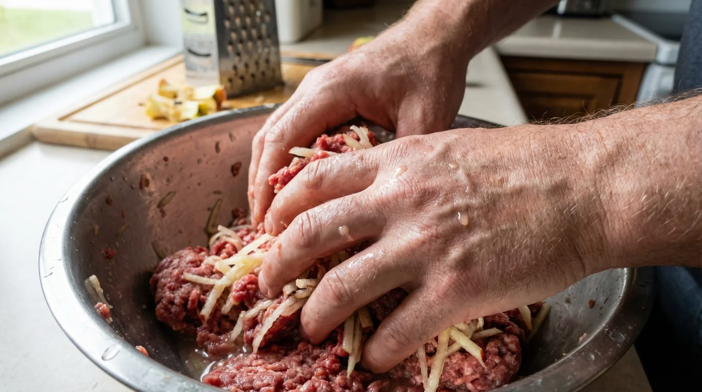 Lösningen vilar faktiskt i fruktskålen. Genom att riva ner ett syrligt äpple och knåda in det i färssmeten förändrar du kemin i grunden. Frukten agerar inte bara som en passiv svamp, utan smälter in mellan köttfibrerna. Detta trick från den äldre matlagningstraditionen låser omedelbart in fukten och bygger en buffert mot hettan som ingen stärkelse i världen kan mäta sig med.